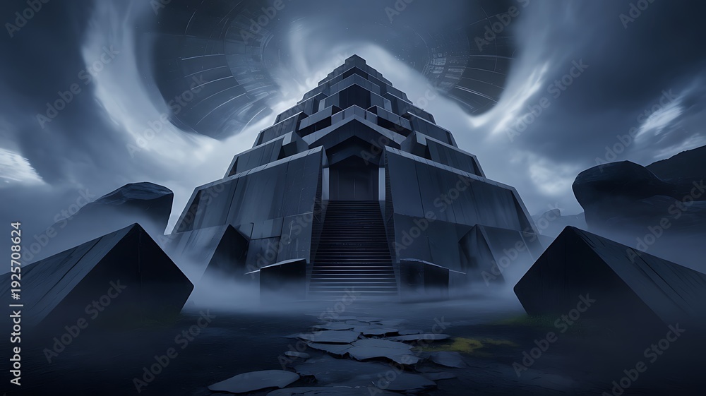 Ominous Sci-Fi Pyramid in Foggy Landscape | Ancient Alien Temple under Dark Skies #1925708624