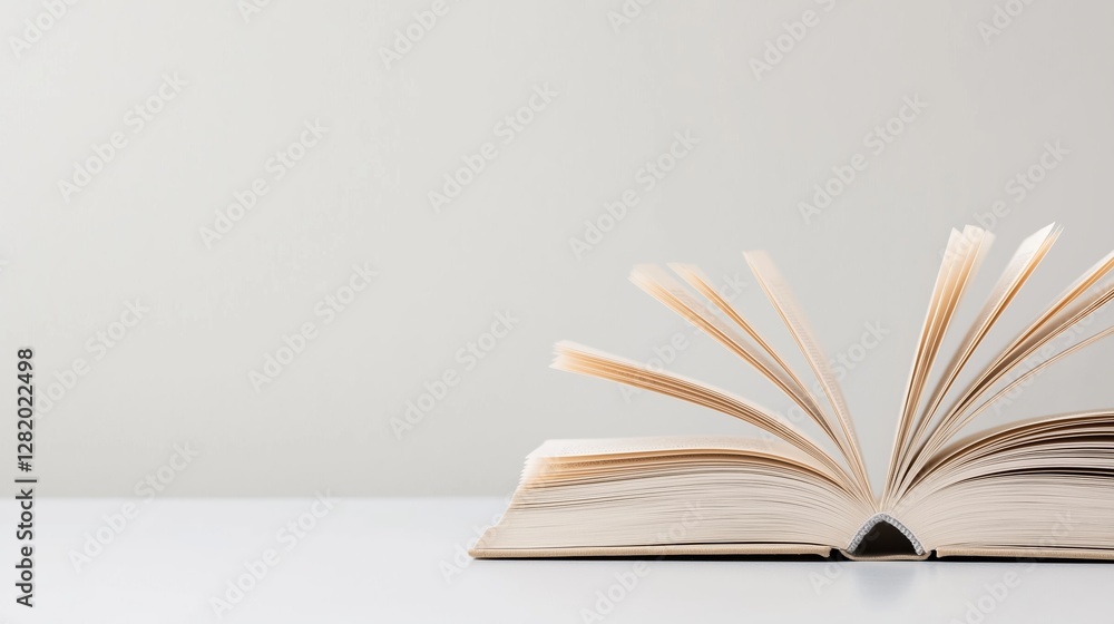 Open book on a clean table with pages fanned out, inviting reading and exploration of new ideas #1282022498