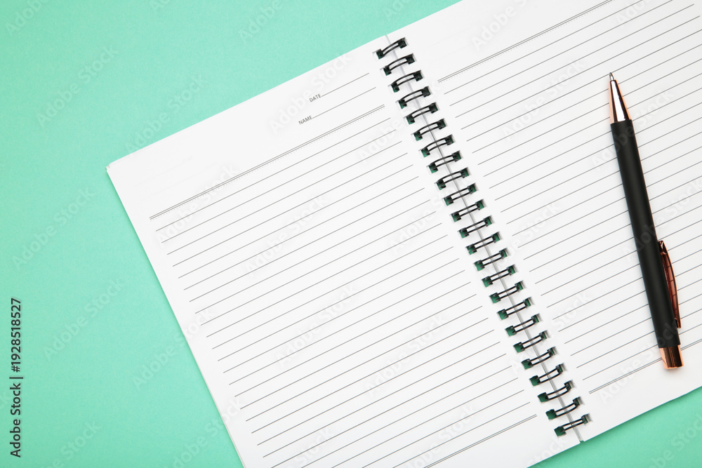 Open notepad and pen on mint background. Space for writing. #1928518527