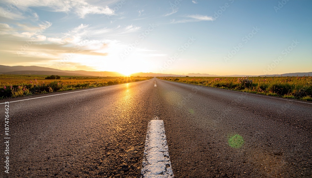 Open road at sunset, stretching to the horizon with a warm glow and a clear path forward towards endless possibilities #1874764623