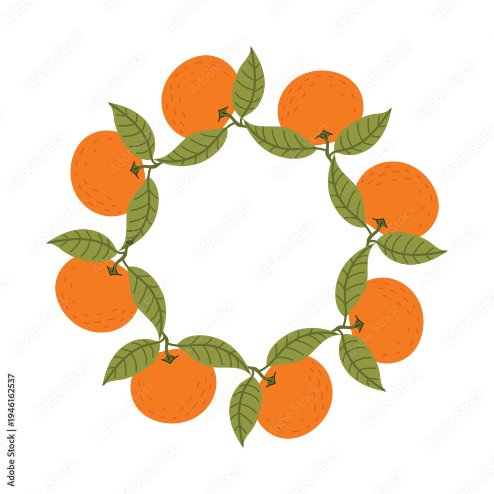 Orange wreath with citrus fruits, leaves and blossoms forming round decorative frame. Fresh botanical citrus illustration isolated on white background for packaging, labels and food branding. #1946162537
