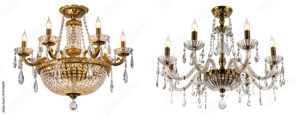 Ornate Crystal Chandeliers with Golden Frames Illuminated for Luxurious Interior Decor Isolated on Transparent Background #1737966191