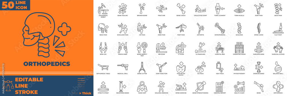 Orthopedics Line editable icon set. Contain icons related to orthopedics, bone, joint, and more #1751909178