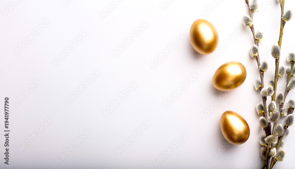 Osterkomposition mit goldenen Eiern und Weidenzweigen auf weißem Hintergrund #1941977790