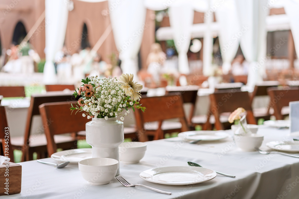 Outdoor wedding dinner table reception in romantic garden wedding atmosphere #1785452613