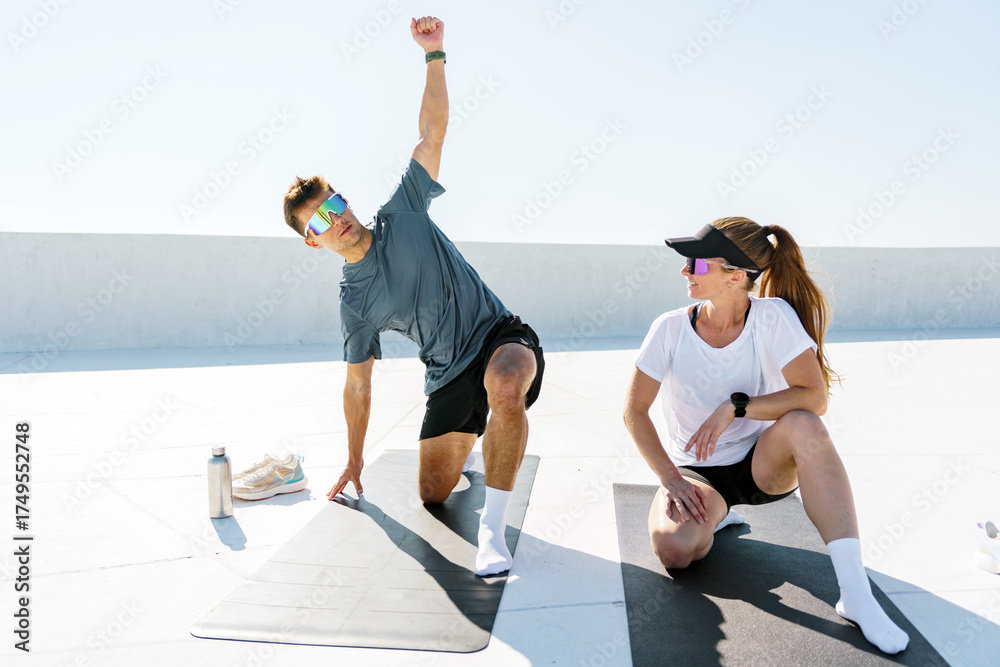 Outdoor workout session with two fitness enthusiasts practicing yoga #1749552748