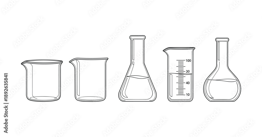 Outline of different laboratory glassware illustrations including beakers and flasks #1892635841