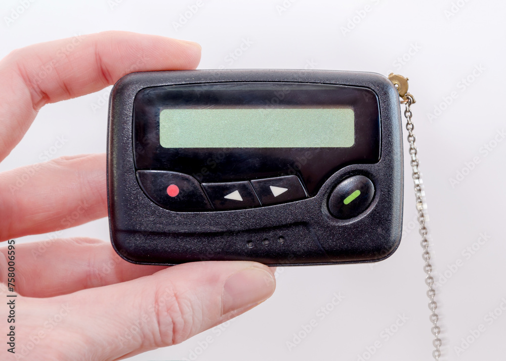 pager in close-up, an old retro communication device, in female hand on a white background #758006595