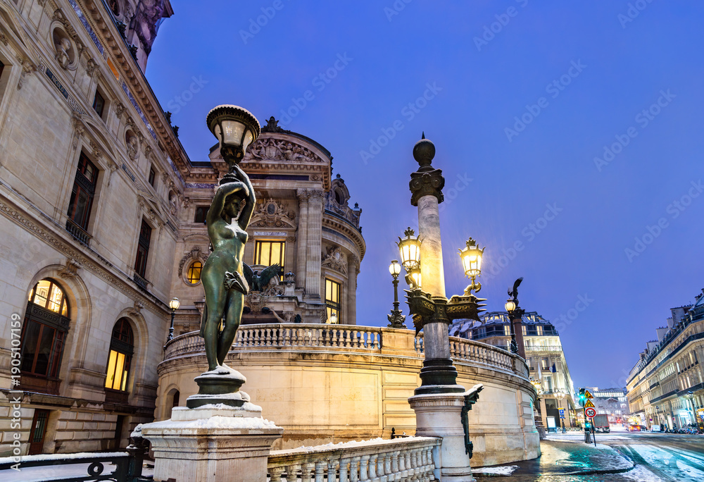 Palais Garnier is located in the 9th district of Paris, France. Winter scene features a bronze statue holding a lamp on the exterior facade covered in snow during the evening #1905107159