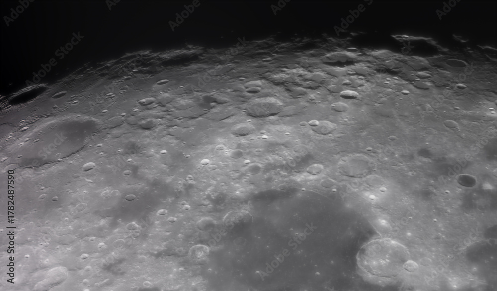 Panoramic view of the Moon surface, showing intricate details of its craters and rugged terrain. The image captures the texture, shadows, and natural formations of the lunar landscape. #1782487590
