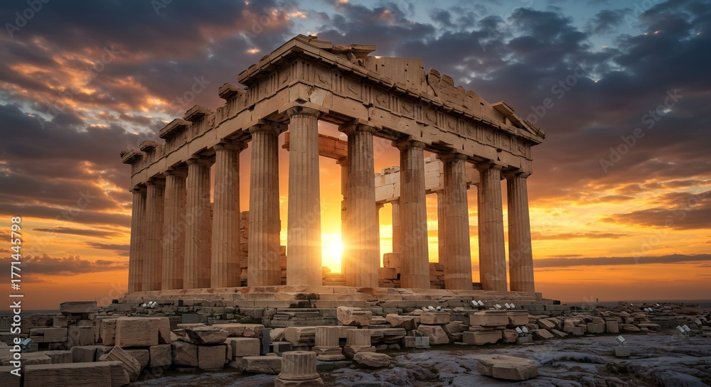 Parthenon at Sunset Iconic Greek Temple on the Acropolis with Athens, and with Golden Sky. #1771445798