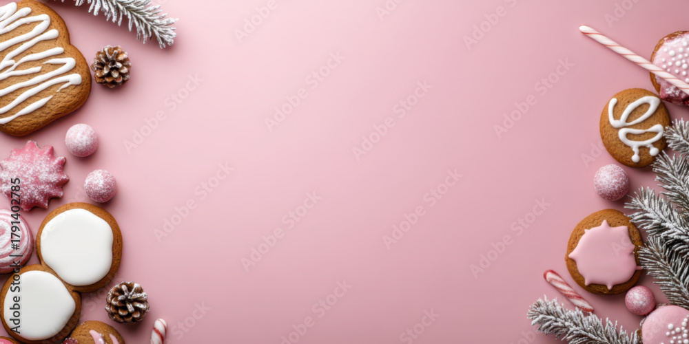 Pastel pink Christmas background with gingerbread and copy space #1791402785