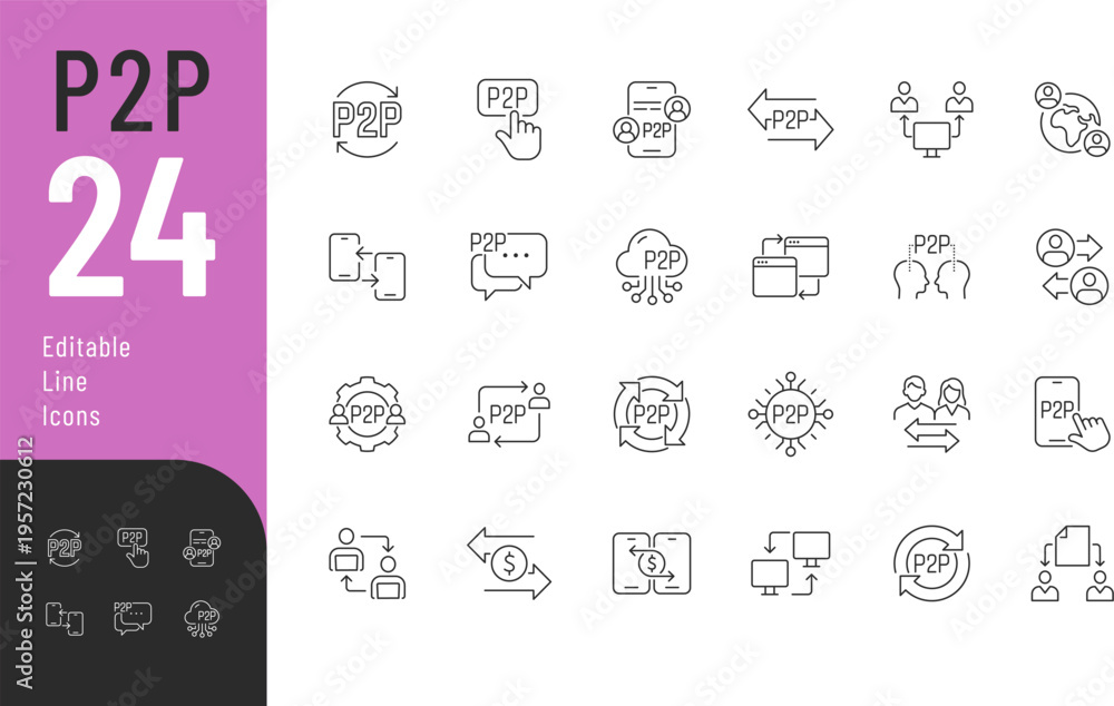 Peet to Peer Line Editable Icons set. Vector illustration in modern thin style of technology related icons: money transfer, digital payment, decentralized network, and more. #1957230612
