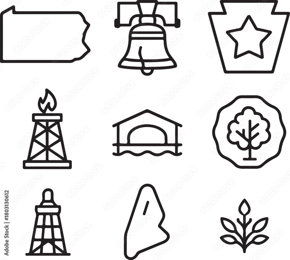 Pennsylvania state symbols and landmarks icon set: featuring liberty bell, keystone, covered bridge, oil derrick, and natural elements. isolated on white background, Vector, illustration #1803130612