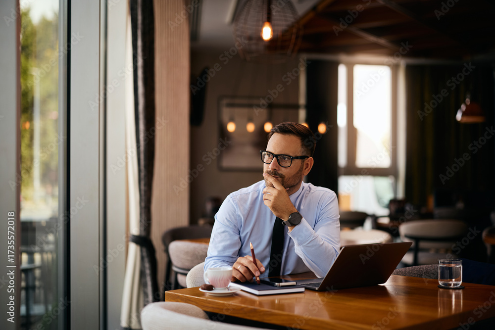 Pensive businessman looking through window while working on laptop in cafe. #1735572018