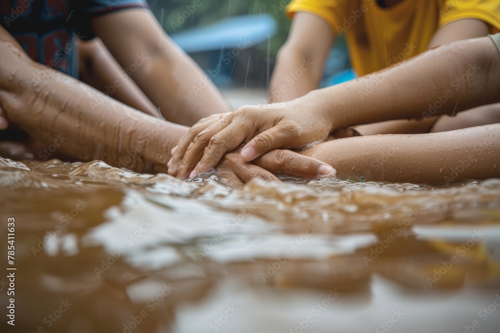 People Holding Hands in Human Chain for Floodwater Rescue Operation, Demonstrating Unity and Support During Natural Disaster Crisis. #785411633