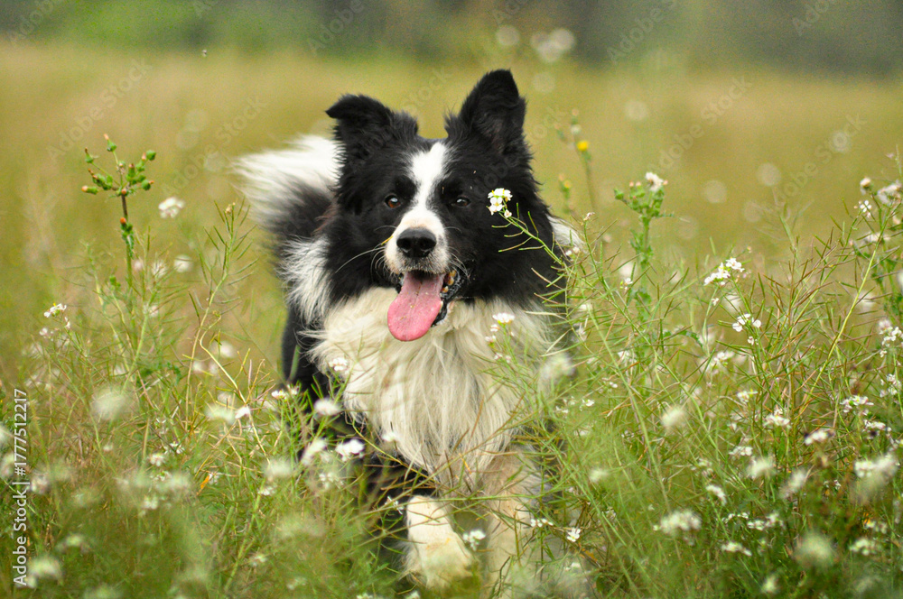 Perro Border collie con la lengua fuera feliz por un prado en la naturaleza #1777512217