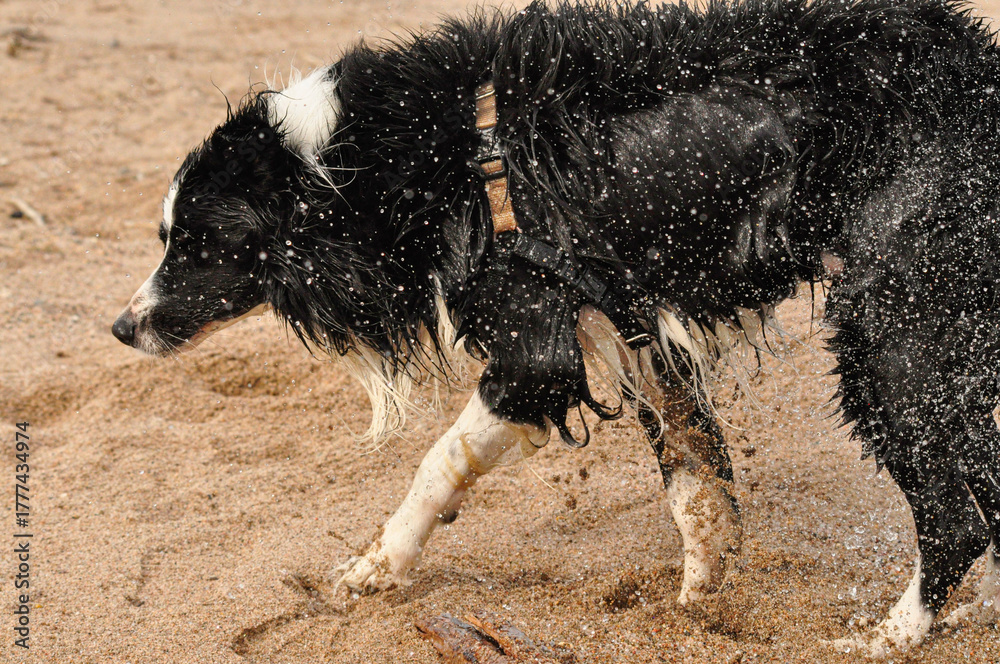 Perro Border collie saliendo mojado del mar y sacudiendo el agua #1777434974
