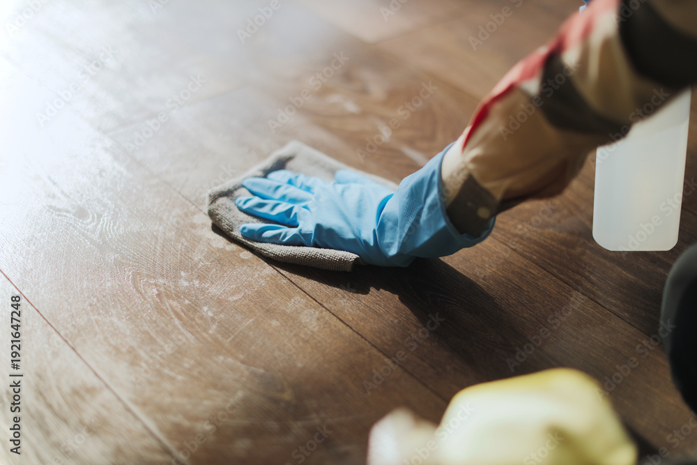 Person cleans wooden floor with cloth and spray bottle in home setting during day #1921647248