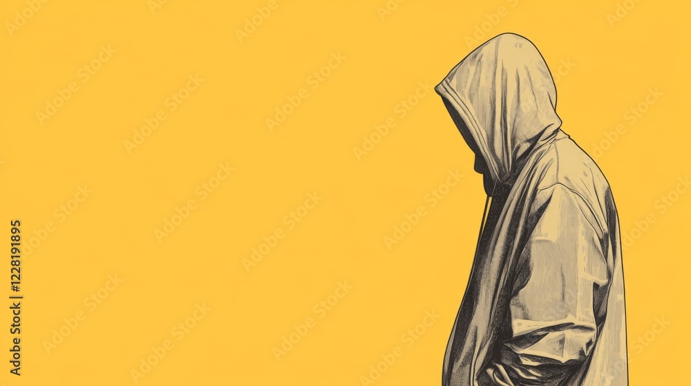 Person in hooded jacket, side profile, yellow background. #1228191895