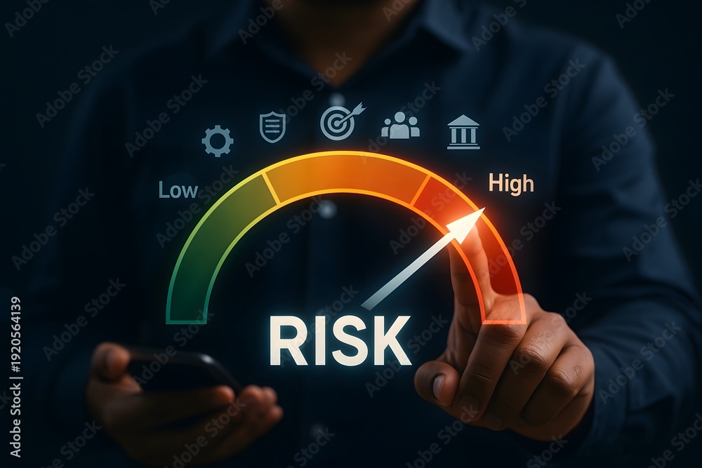 Person's finger points to a "high" risk level on a virtual gauge, indicating increased business or financial risk. #1920564139