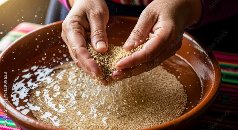 person's hands rinsing quinoa in a terracotta bowl #1712909623