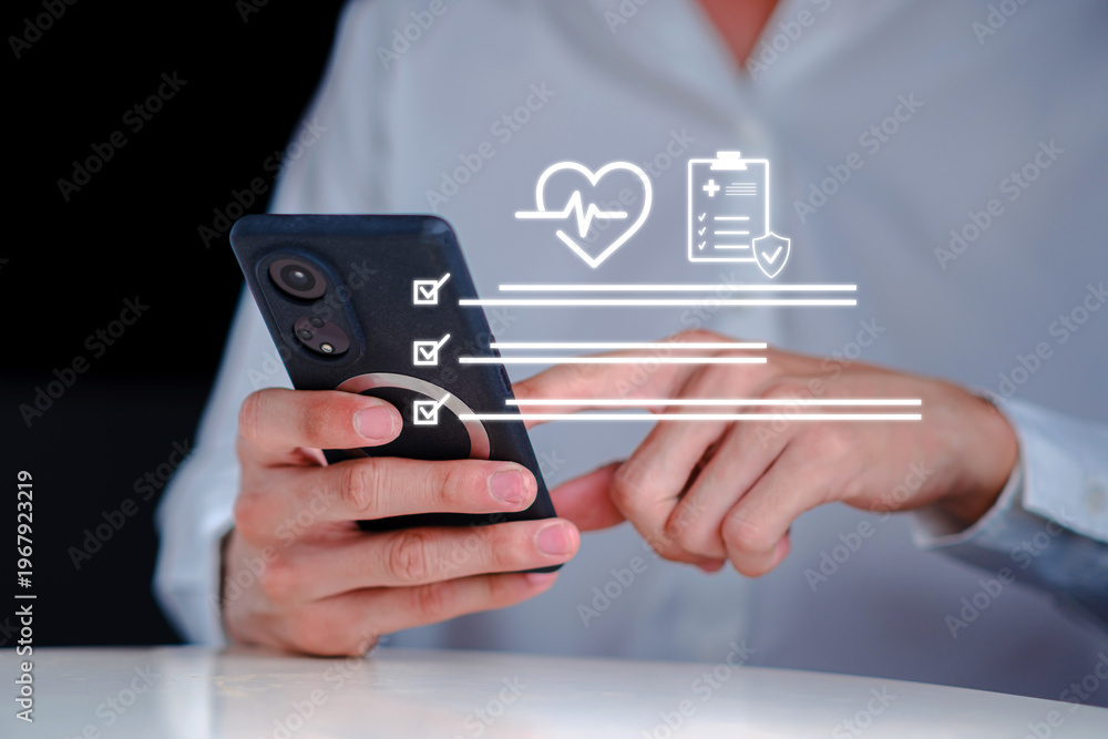 Person using smartphone to manage digital health checklist with medical icons, representing telemedicine, health monitoring, patient data tracking, and mobile healthcare technology lifestyle #1967923219