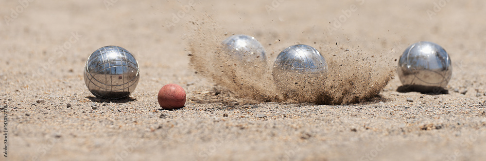 Petanque ball boules bowls on a dust floor, photo in impact. Balls and a small wood jack #443052779