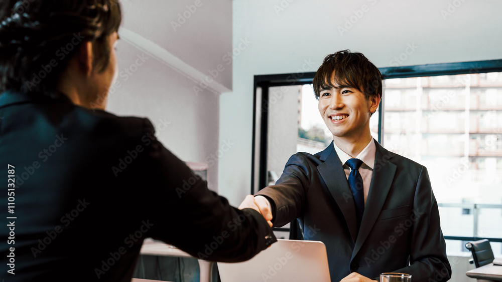 オフィスの会議室で笑顔で握手をする中小企業やスタートアップのビジネスマンの男性2人 #1105132187