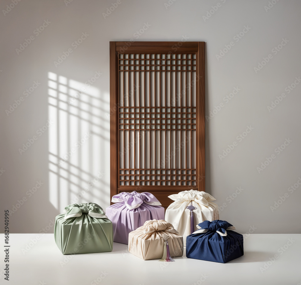 다양한 색상의 보자기 추석 선물세트, 한옥 창호 배경 #1682940995