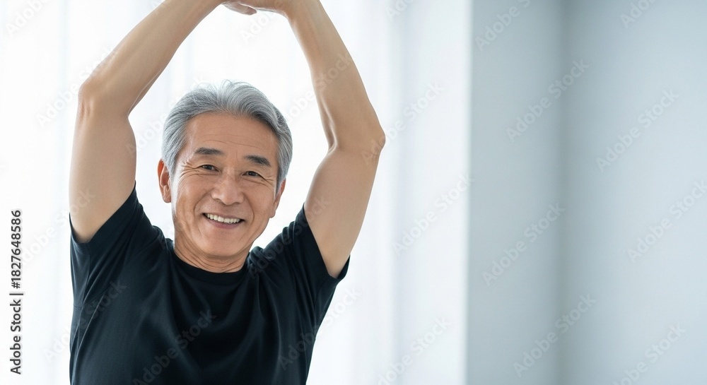 遠赤外線とマイナスイオン放出効果のある機能性ウェアを着て、笑顔でストレッチをしている日本人シニア男性 #1827648586