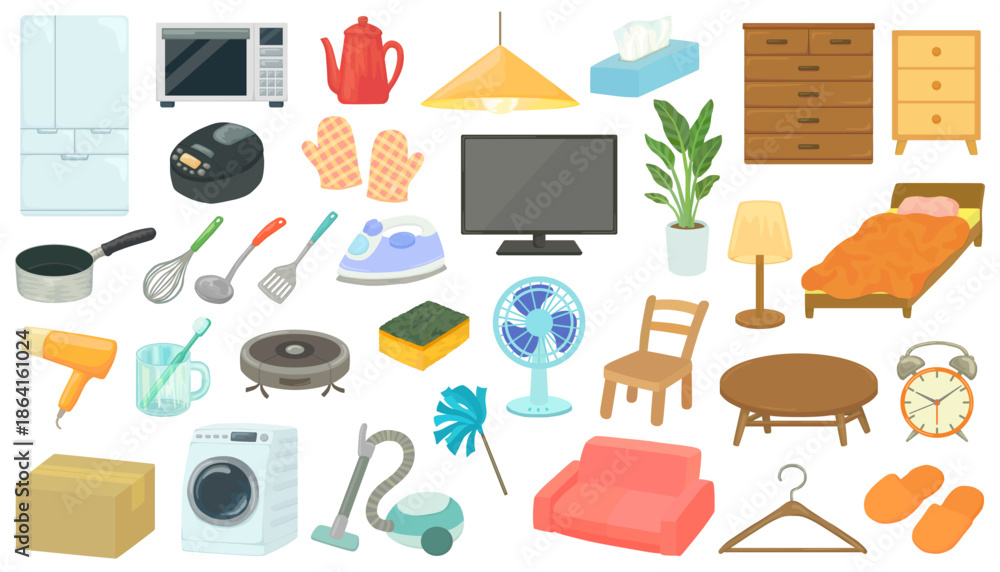 家具・家電・生活雑貨のイラストセット 新生活 住まい ベクター素材 #1864161024