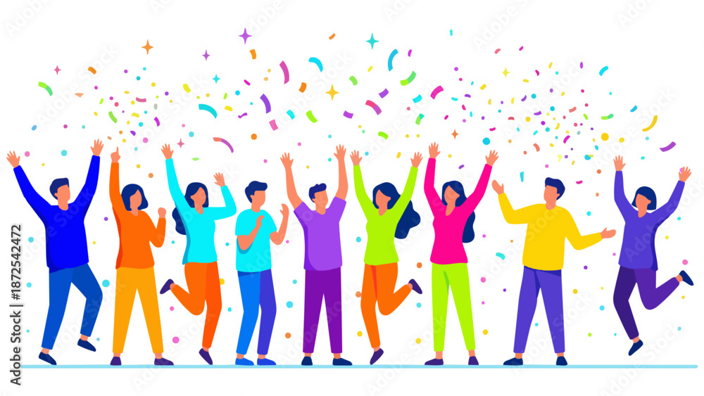 紙吹雪でカラフルな仲間がガッツポーズでわいわい喜び達成を祝う色鮮やかな人々がバンザイする喜び #1872542472