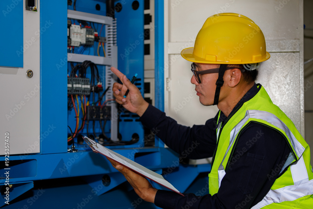 ชายชาวเอเชียวัยผู้ใหญ่ ช่างเทคนิคอุตสาหกรรม สวมหมวกนิรภัยและเสื้อกั๊กนิรภัย ตรวจสอบตู้ควบคุมเครื่องจักรในโรงงาน #1925357420
