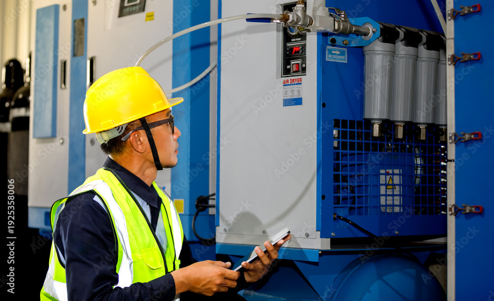 ชายชาวเอเชียวัยผู้ใหญ่ ช่างเทคนิคอุตสาหกรรม สวมหมวกนิรภัยและเสื้อกั๊กนิรภัย ตรวจสอบตู้ควบคุมเครื่องจักรในโรงงาน #1925358006