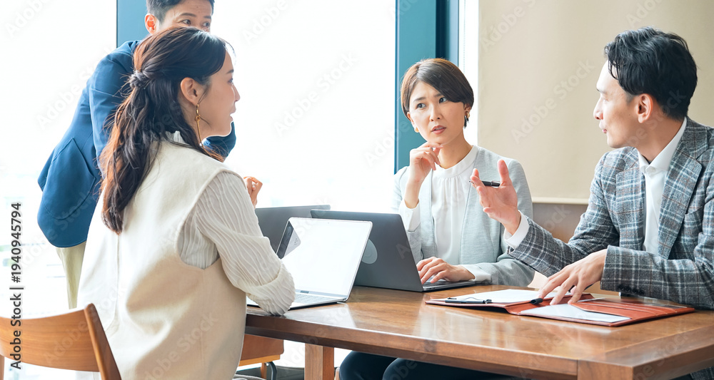 オフィスで会議するカジュアルなビジネスパーソンのグループ #1940945794