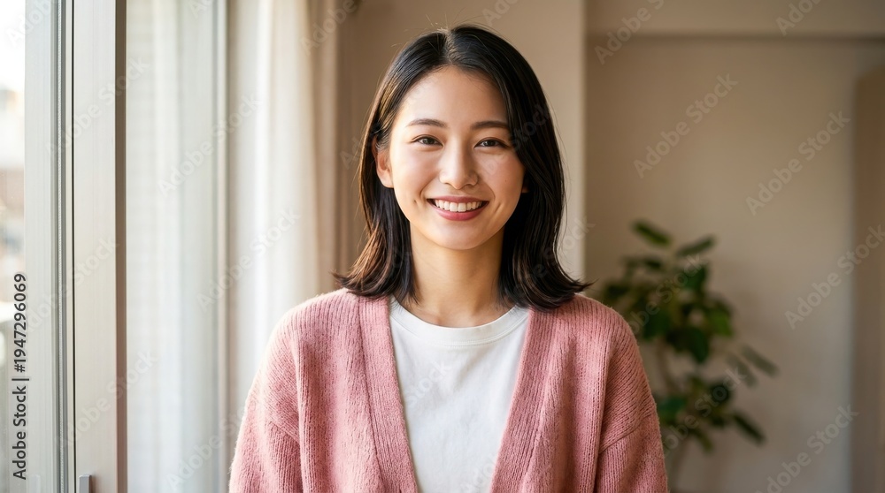 部屋の窓際でピンクのカーディガンを着て微笑む若い女性 #1947296069