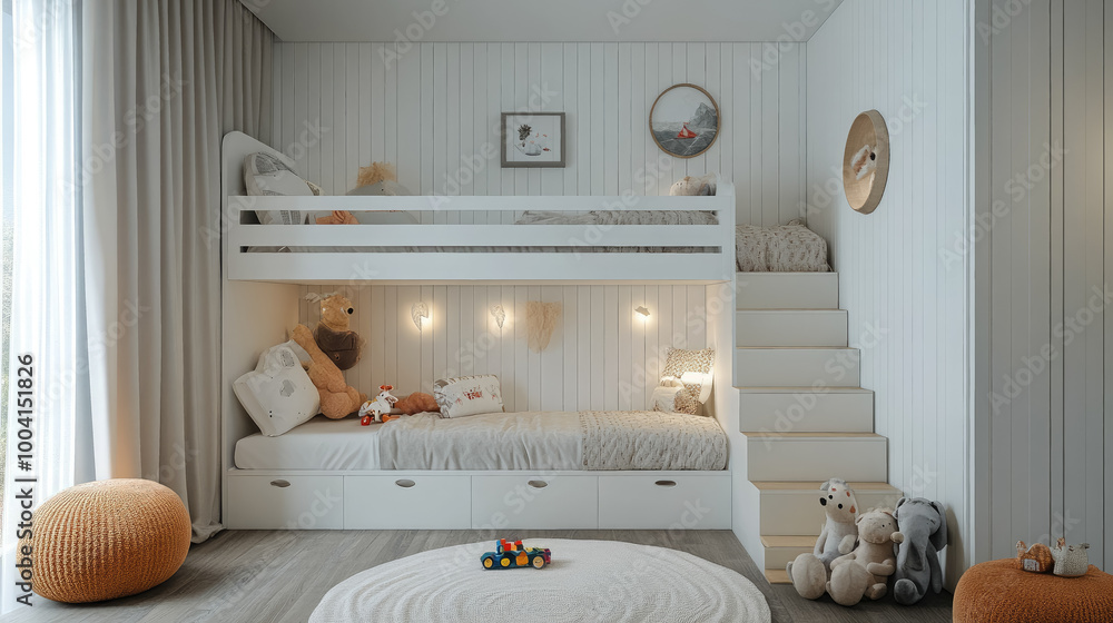 photo of stylish white kids room with toys, scandinavian style, bunk bed, interior design, house, apartment, real estate, furniture, bedding, pillows, daylight #1004151826