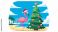 Pink flamingo wearing santa hat standing near christmas tree on a tropical beach scene illustration #1771017910