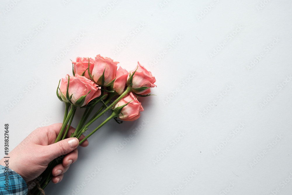 Pink roses held by hand over copy-space on clean white flat lay background #1931827648