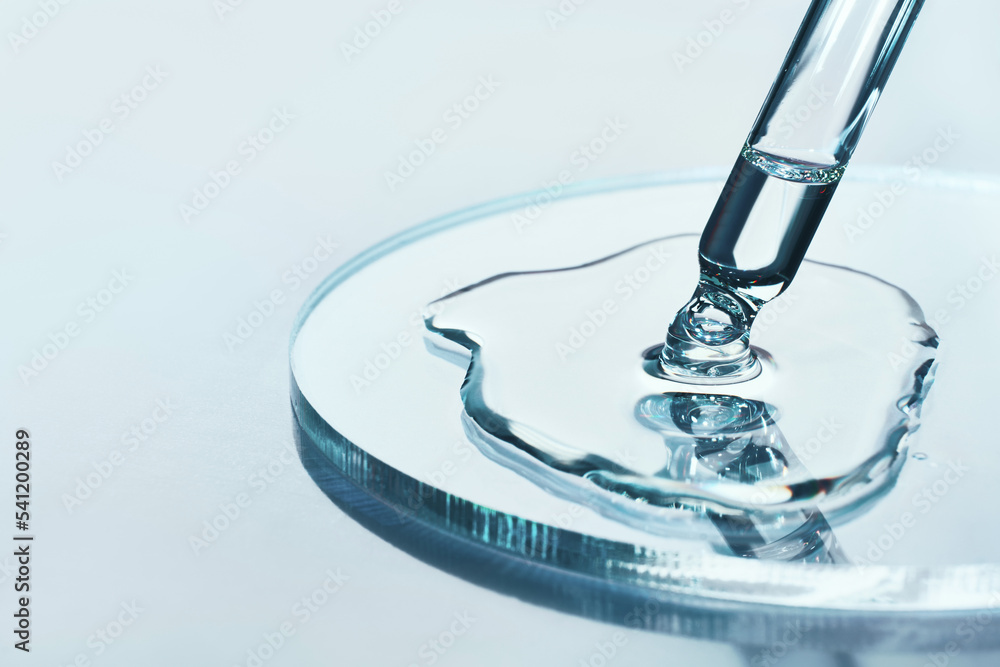 Pipette with sample of cosmetic product in petri dish on blue background, selective focus #541200289