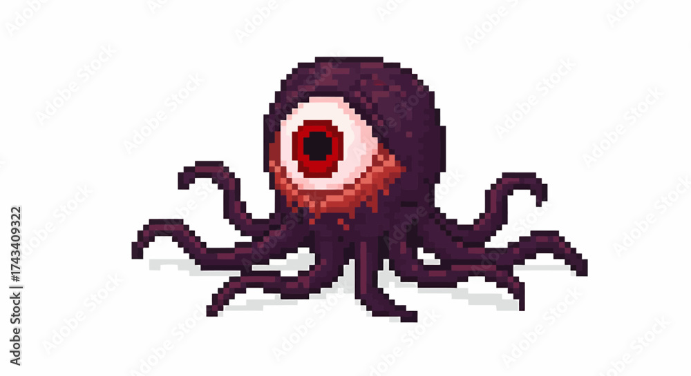 Pixel art monster with a large central eye, red iris, and multiple dark tentacles, resembling a game enemy. #1743409322