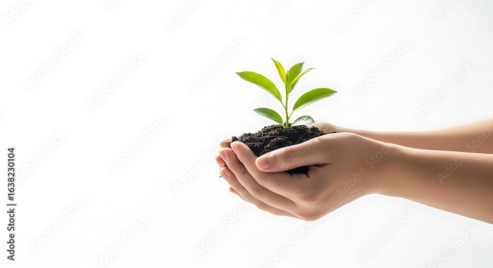 Planting new life: hands gently hold a vibrant green sprout in rich soil. Symbolizing growth, nature, and sustainability on a bright white background. Ideal for eco-friendly concepts. #1638230104