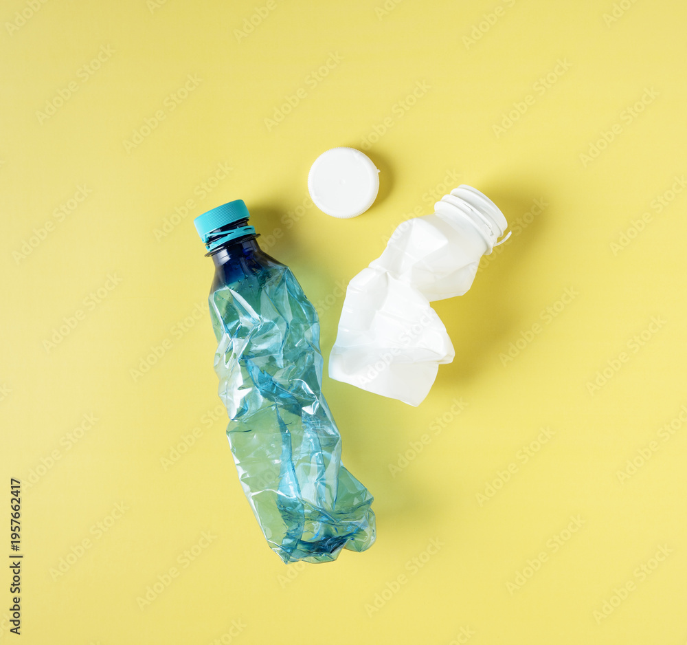 Plastic waste on yellow background, plastic recycling concept. Waste separation concept promoting recycling and environmental responsibility. #1957662417
