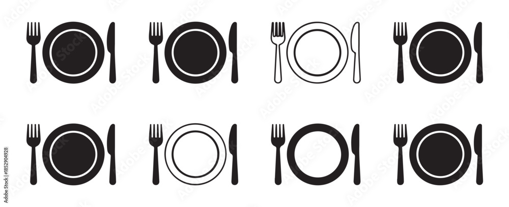 plate knife fork icons set restaurant dish meal cutlery vector illustration graphic #1852904928