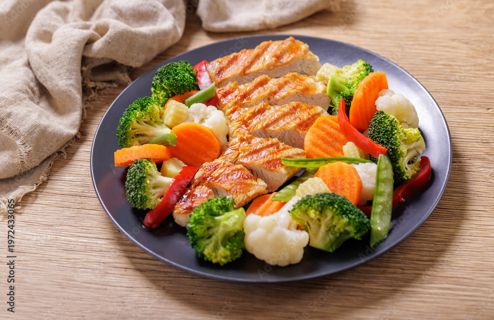 plate of grilled chicken and mix of steamed vegetables #1972433065