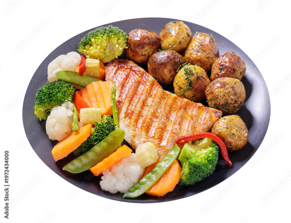 plate of grilled chicken with steamed vegetables and baked potatoes isolated on transparent background #1972434000