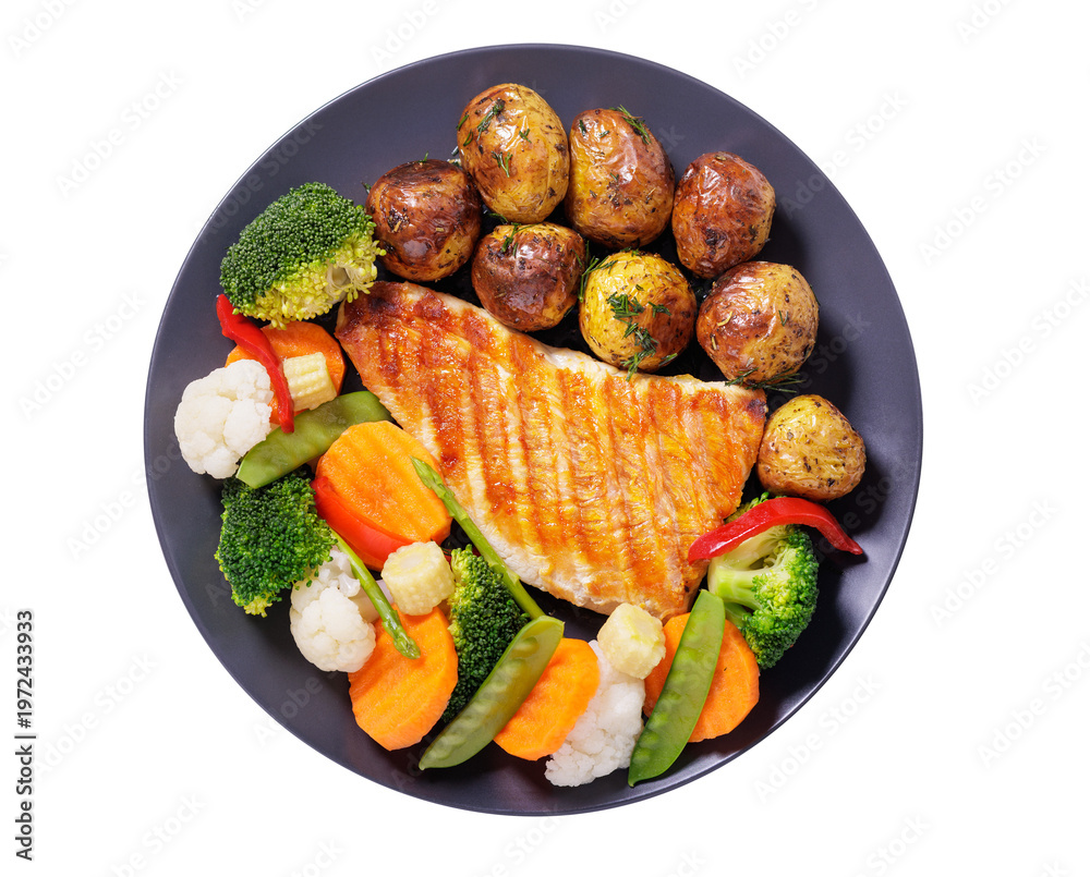 plate of grilled chicken with steamed vegetables and baked potatoes isolated on transparent background, top view #1972433933