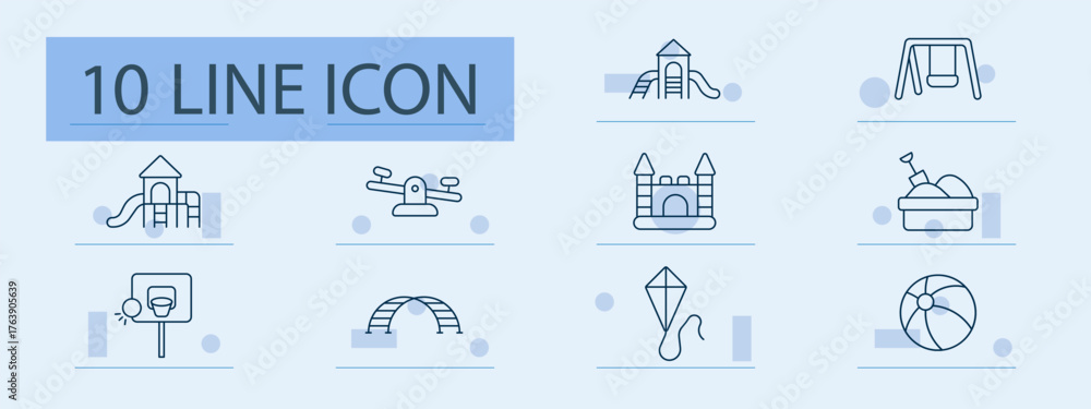 Playground set icon. Line icons with slide, swing, see-saw, castle, sandbox, basketball hoop, ball, kite, bridge arch, climbing tower #1763905639