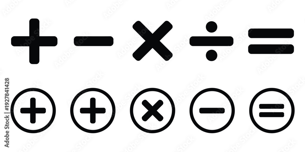 Plus, minus, multiply, divide, and equal sign icon design set, featuring addition, subtraction, multiplication, division, and equality mathematical symbols in vector format. #1927841428